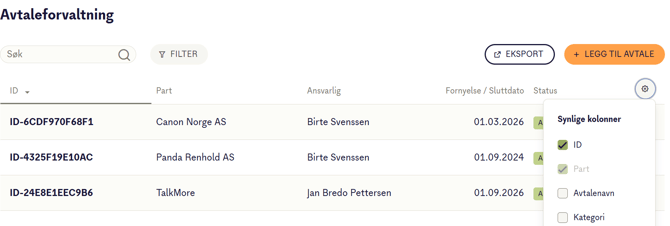 For å se ID-ene i oversikten må du gjøre ID-kolonnen synlig i tabellvisningen. Du kan også søke på ID i søkefeltet for raskt å finne riktig avtale eller protokoll.