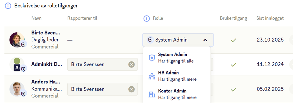 Som administrator kan du enkelt endre roller for ansatte i systemet.