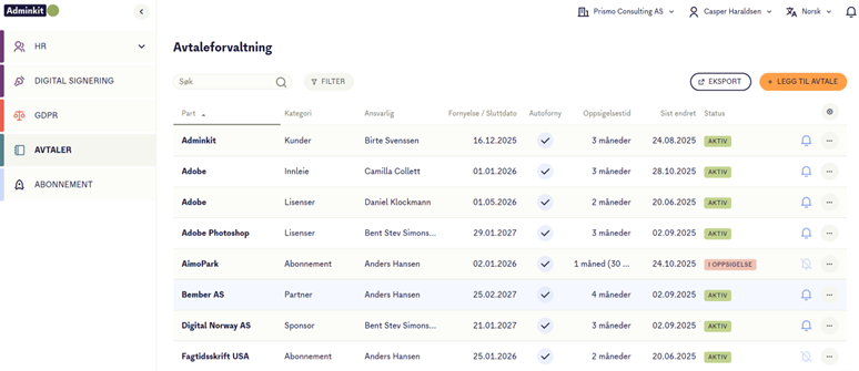 Hvordan få oversikt over fakturaer og betalinger i systemet? For å få oversikt over fakturaer og betalinger går du til Avtaler.Der finner du alle fakturaer og betalinger som er lagt inn i systemet.