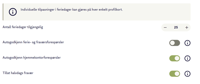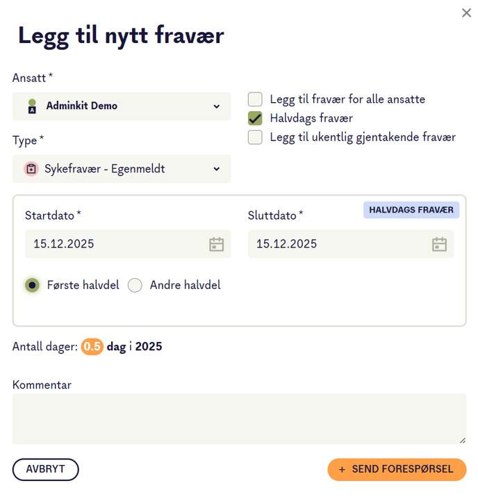 Tips: Pass på at halvdags fravær er aktivert i innstillingene til bedriften din.