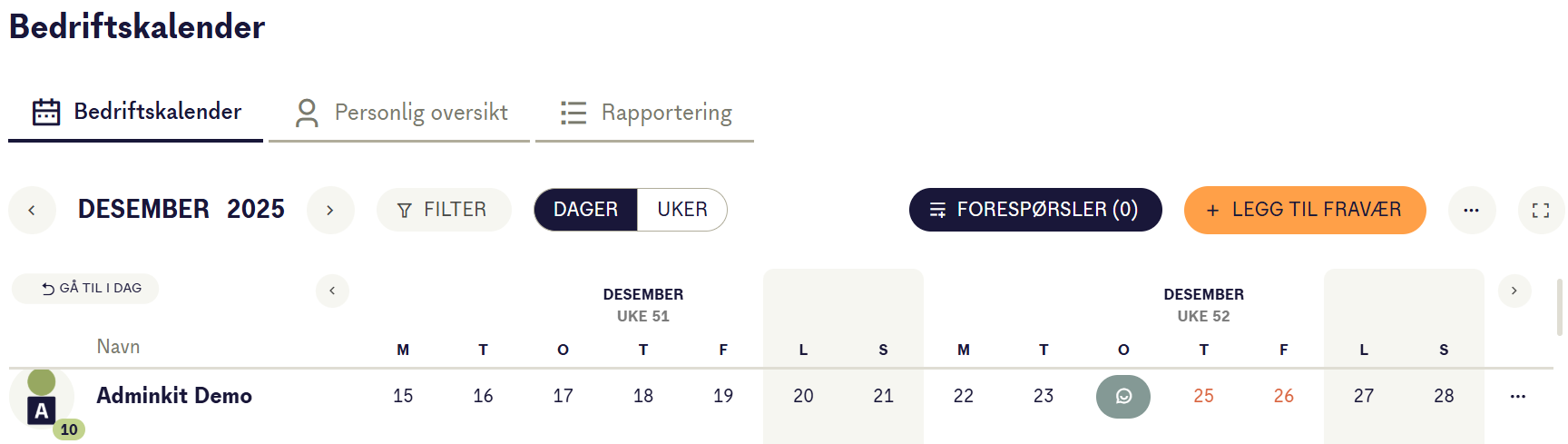 Hvordan vise alle helligdager i bedriftskalenderen? Alle helligdager vises automatisk i bedriftskalenderen.De er markert i rødt, slik at de enkelt kan skilles fra vanlige arbeidsdager.