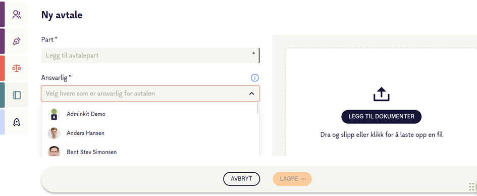 Dersom dette ikke passer, kan du endre hvem som skal være ansvarlig i feltet Ansvarlig før du lagrer kontrakten.